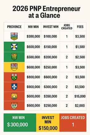 | Province | Net Worth Min | Investment Min | Jobs Created | Fees |